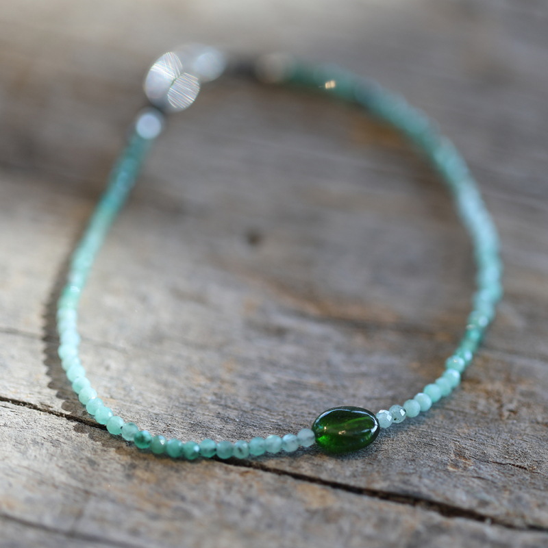 Emerald beads are accented by larger Chrome Diopside bead in the center in this bracelet with a silver clasp by Margaret Solow.