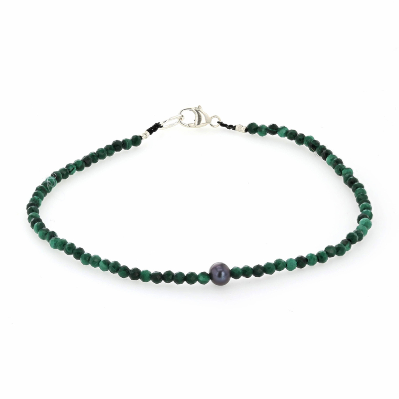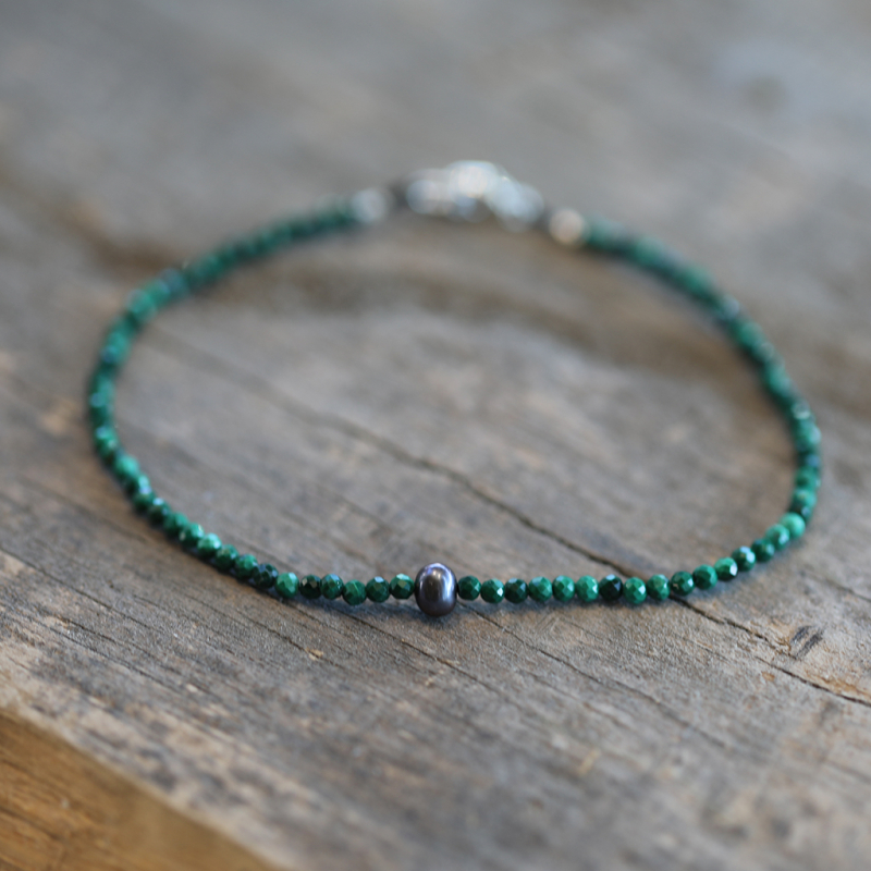 Malachite beads are accented by larger Pearl in the center in this bracelet with a silver clasp by Margaret Solow.