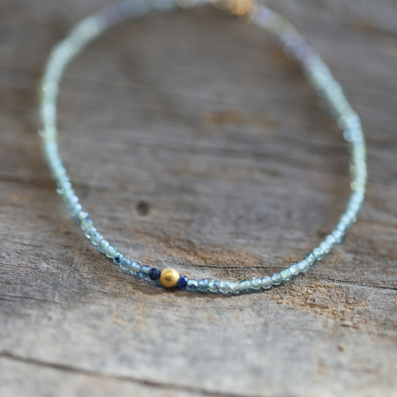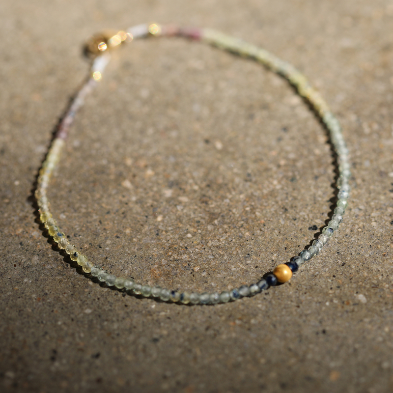 Gradations of multi-colored Sapphires are accented in the center by an 18k gold bead. This beaded bracelet by Margaret Solow has a 14k yellow gold lobster clasp.