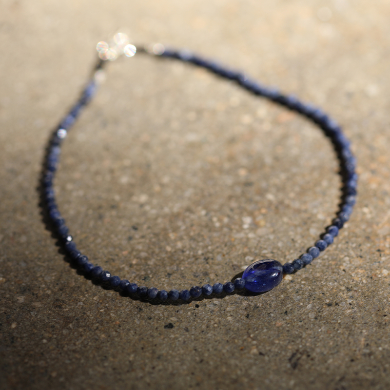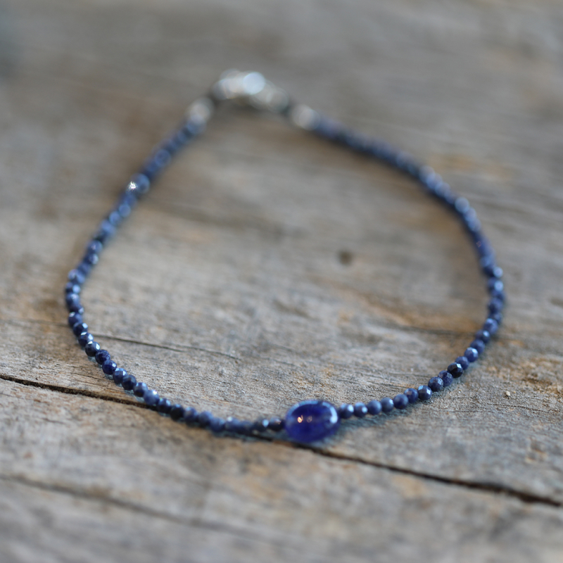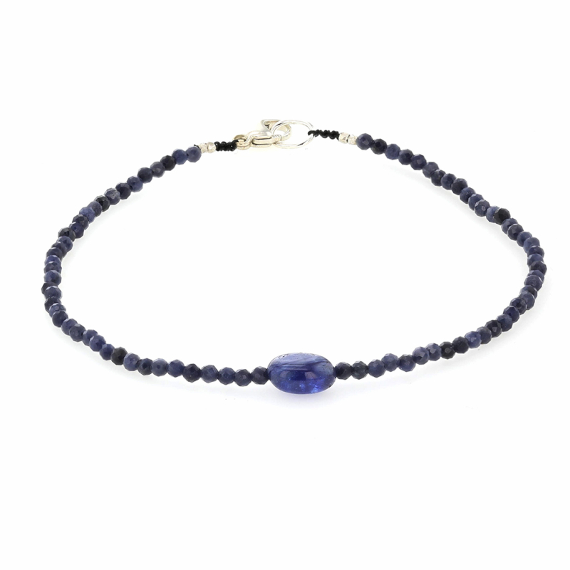 Sapphire beads are accented by larger Sapphire in the center in this beaded bracelet with a silver clasp by Margaret Solow.
