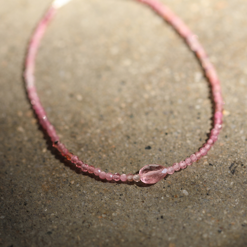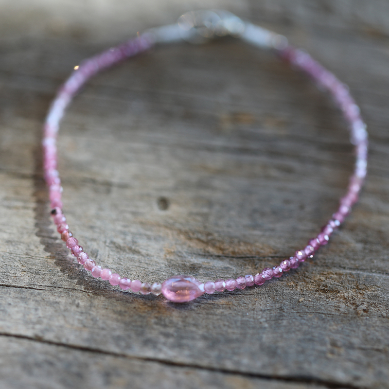 Margaret Solow sets Tourmaline beads with a larger Tourmaline accent bead in the center of this bracelet with a silver clasp.