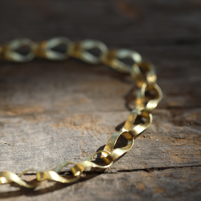 18k gold Mobius shaped links form a chain with a 22k gold ball on its clasp ni this bracelet by Petra Class. We love the finish on the gold, feel and weight. Just perfect!