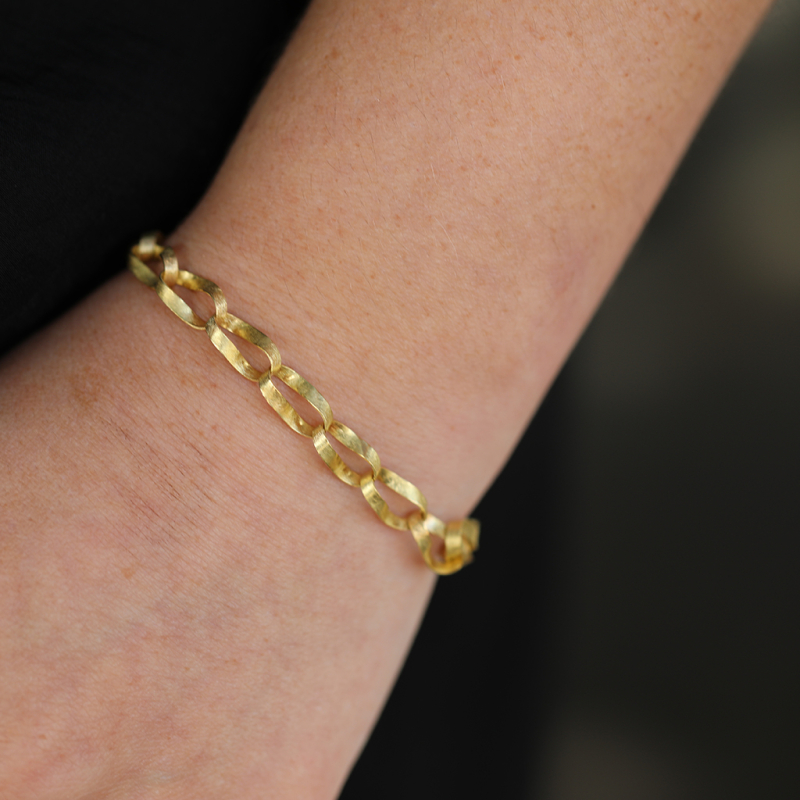 18k gold Mobius shaped links form a chain with a 22k gold ball on its clasp ni this bracelet by Petra Class. We love the finish on the gold, feel and weight. Just perfect!