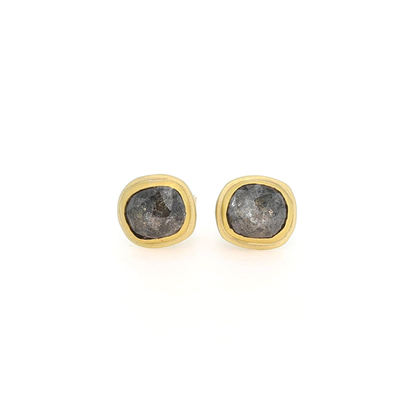 Rosecut Grey Diamonds are set in 22k gold bezel with an 18k gold back in these stud earrings with a 14k gold post by Ananda Khalsa. Perfect for everyday unique diamond post stud earrings.