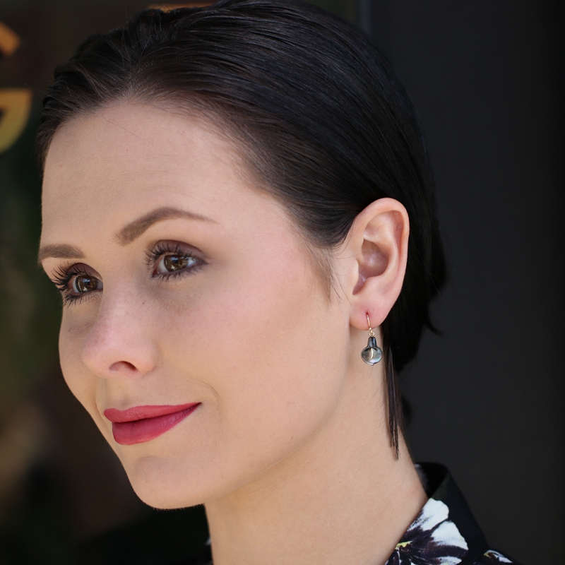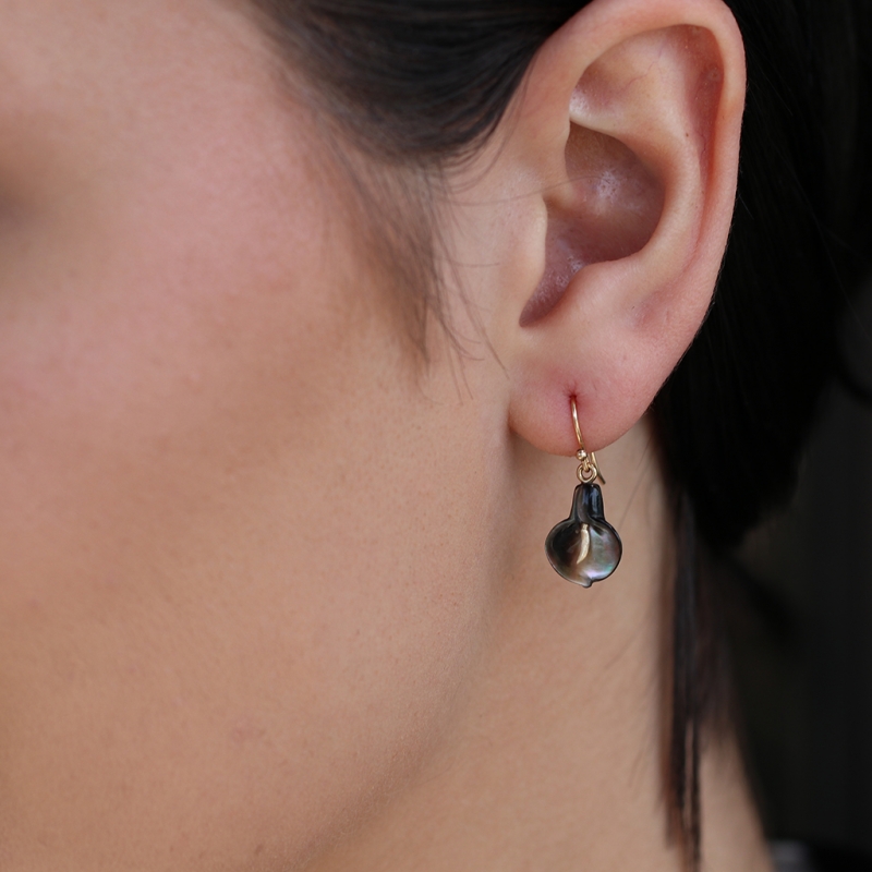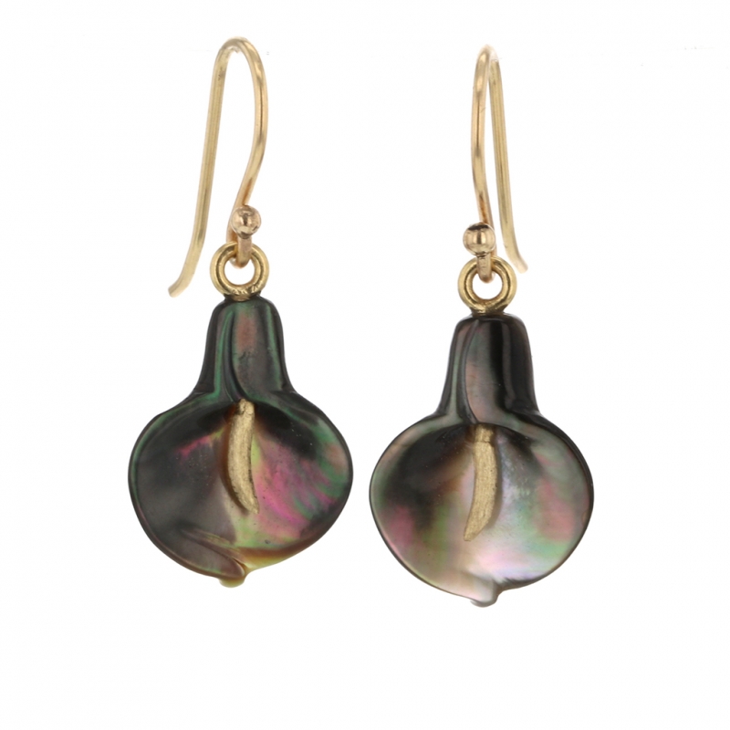 Annette Ferdinandsen's signature calla lily earrings. These earrings feature Black Mother of Pearl and hang from 14k yellow gold earrings. These delicate and nature inspired designs are both feminine and earthly. Calla Lilies are trumpet-like flowers which have become symbols of youth and rebirth.