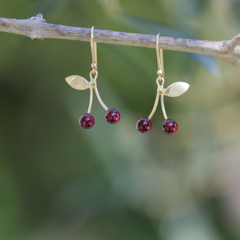 Love these whimiscal garnet cherry earrings set in 14k yellow gold earrings.
