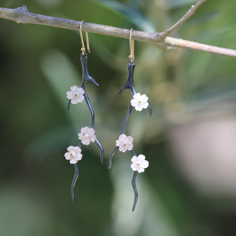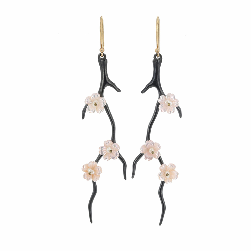 Elegant oxidized silver branches hold pink mother of pearl and pearl cherry blossoms on 14k yellow gold earwires. Whimisical and playful while also being sophisticated.