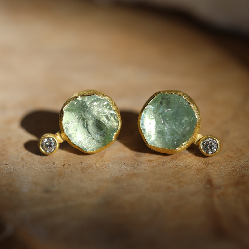 Rough Aquamarine Crystal is set in 22k gold bezel with a small, faceted Diamond on an 18k gold post in these Petra Class earrings. Love the dreamy color of these!