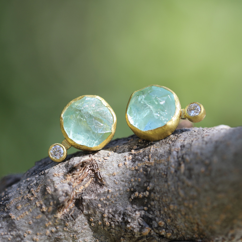 Rough Aquamarine Crystal is set in 22k gold bezel with a small, faceted Diamond on an 18k gold post in these Petra Class earrings. Love the dreamy color of these!