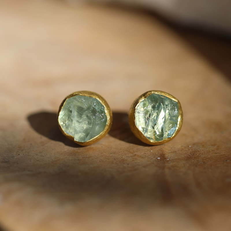 Rough Aquamarine Crystal are set in 22k god bezel on 18k gold posts in these earrings by Petra Class.