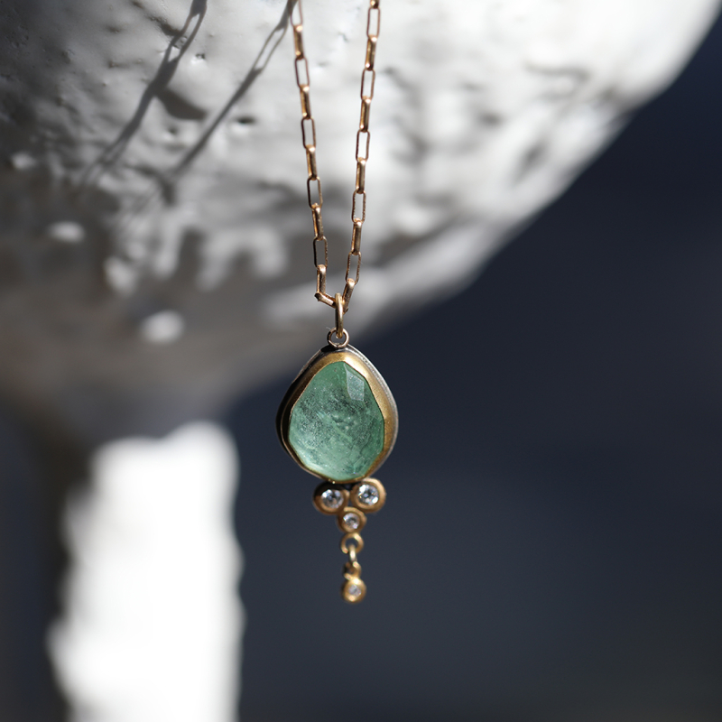 Rosecut Beryl in 22k gold bezel with four Diamonds drop on a 14k gold chain necklace by Ananda Khalsa. Just love this beautiful pendant.