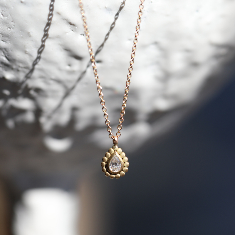 A pear shaped Diamond is set in 22k gold bezel and hangs from a 14k gold chain necklace by Ananda Khalsa.