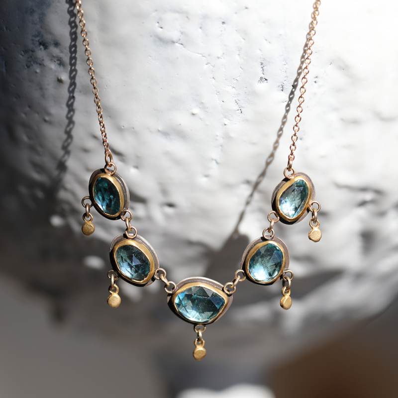Five rosecut Blue Zircon are set in 22k gold bezel with sterling silver backs and hang from a 14k gold chain necklace by Ananda Khalsa. This amazing necklace just sparkles! We love the flat circular accents from botton of the rosecut Zircon gemstones.