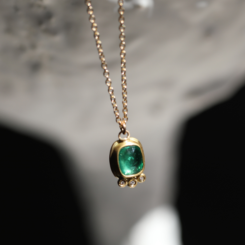A rosecut Emerald set in 22k gold bezel with an 18k gold back has three Diamond accents beneath it. The pendant hangs from a 14k gold chain necklace by Ananda Khalsa.