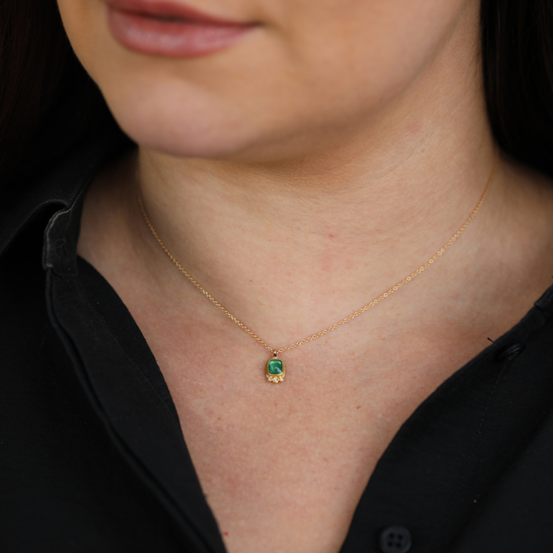 A rosecut Emerald set in 22k gold bezel with an 18k gold back has three Diamond accents beneath it. The pendant hangs from a 14k gold chain necklace by Ananda Khalsa.