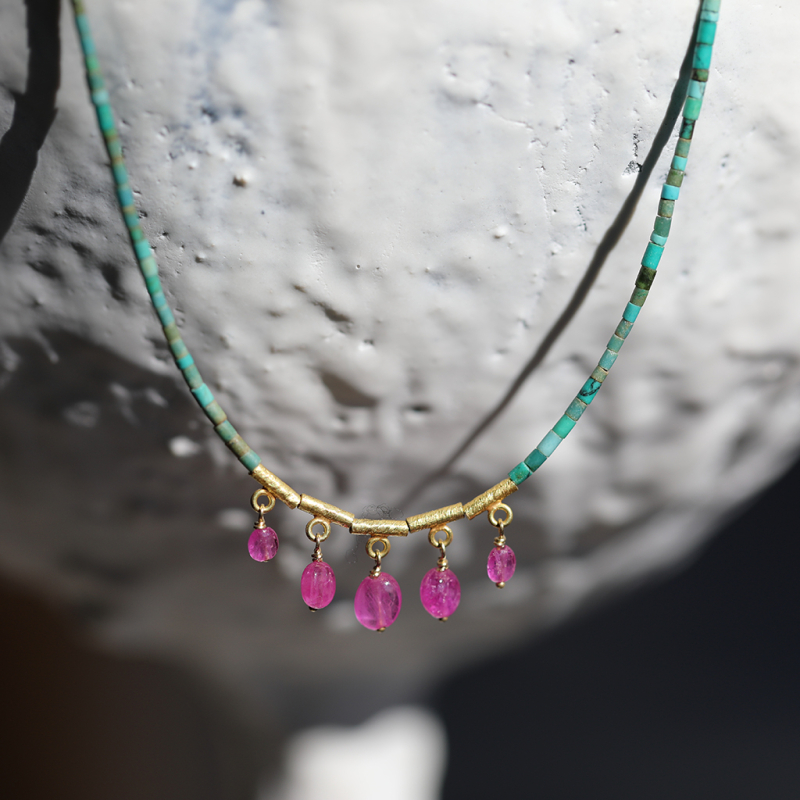 Turquoise beads are accented with Ruby fringe and 20k gold beads in this necklace by Ananda Khalsa.