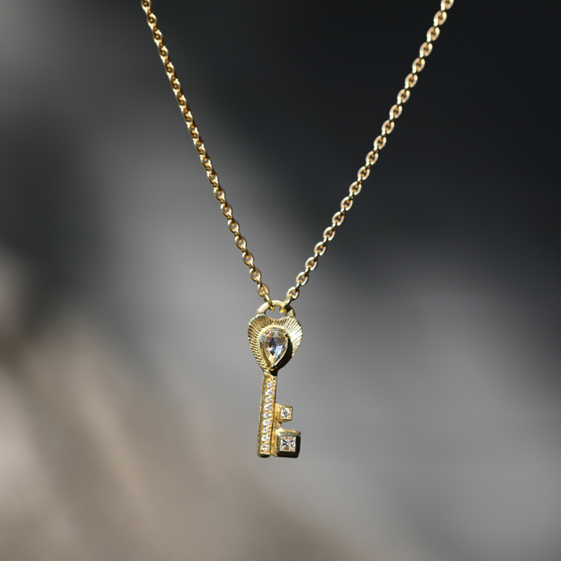 From Brooke Gregson's Key collection is this hand engraved 18k yellow gold key accented by diamonds.