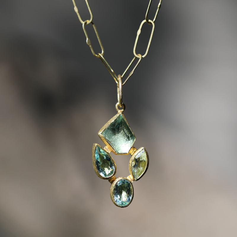 Four mixed shape, faceted Aquamarines set in 22k gold bezel form a mosaic with 18k gold backing, spacers and bail in this pendant by Petra Class. GOLD CHAIN NOT INCLUDED, JUST PENDANT.
