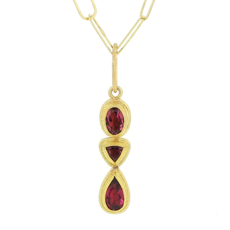 Three mixed shape, faceted Pink Tourmalines are set in 22k gold bezels with 18k wire frames, backings and bail in this pendant by Petra Class. GOLD CHAIN NOT INCLUDED, JUST PENDANT.