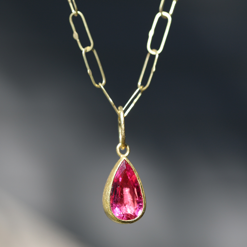 A faceted Pink Tourmaline teardrop is set in 22k gold bezel with an 18k bail and backing in this pendant by Petra Class. GOLD CHAIN NOT INCLUDED, JUST PENDANT