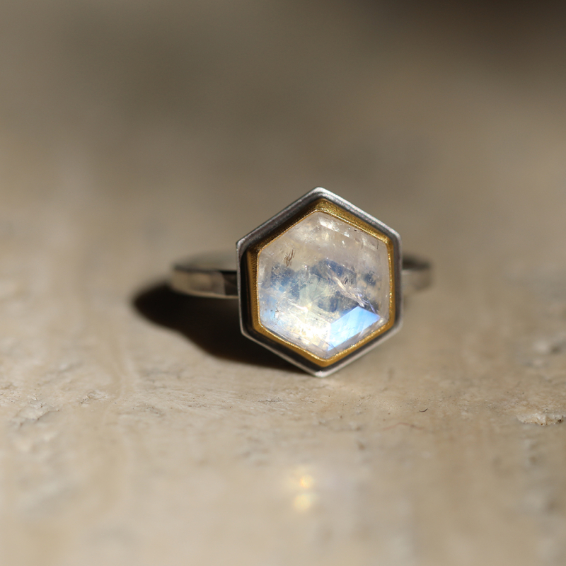 A hexagon shaped Rainbow Moonstone is set in 22k gold bezel on a sterling silver platform and band in this ring by Ananda Khalsa.