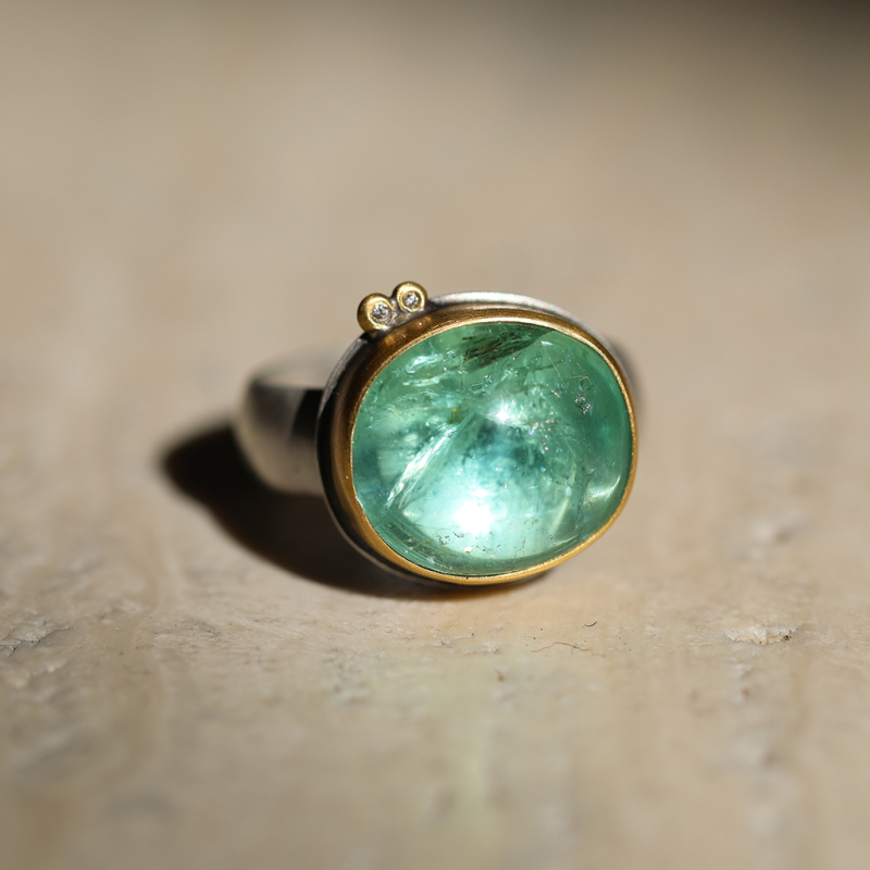 A magical Light Green Tourmaline is set in 22k gold bezel on a sterling silver platform and band with two Diamonds in this ring by Ananda Khalsa.