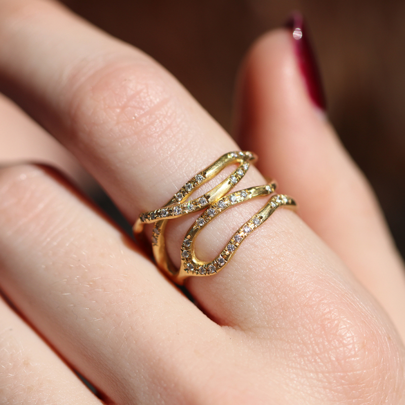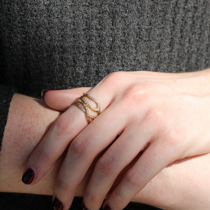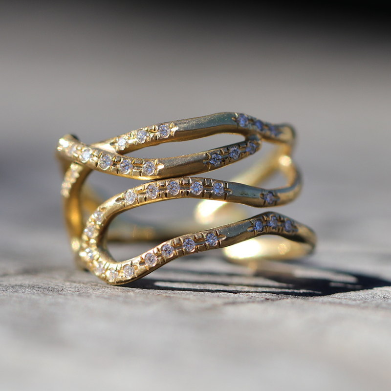 18k gold is formed into a coral branch with Diamond Pave accents in this ring by Annette Ferdinandsen.