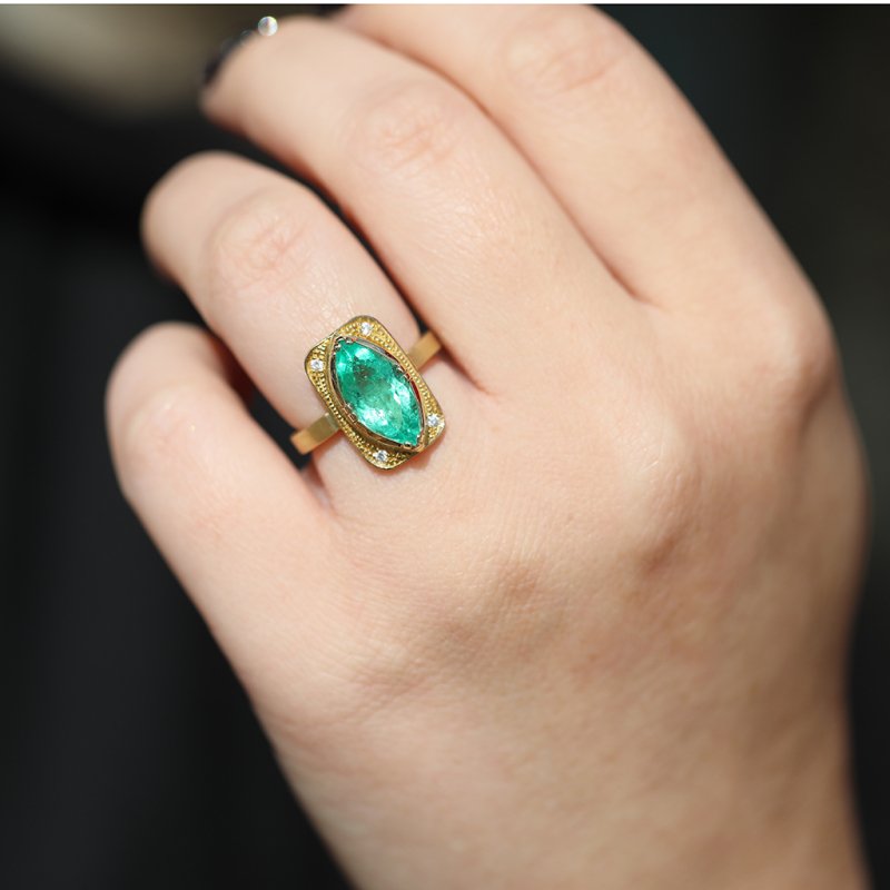 A marquise Columbian Emerald is set in hand engraved 18k gold with Diamonds in this ring by Brooke Gregson. This emerald is one of the most magical emeralds we have ever been so lucky to acquire.