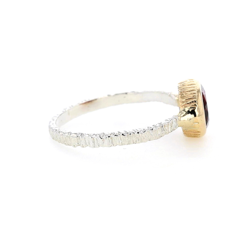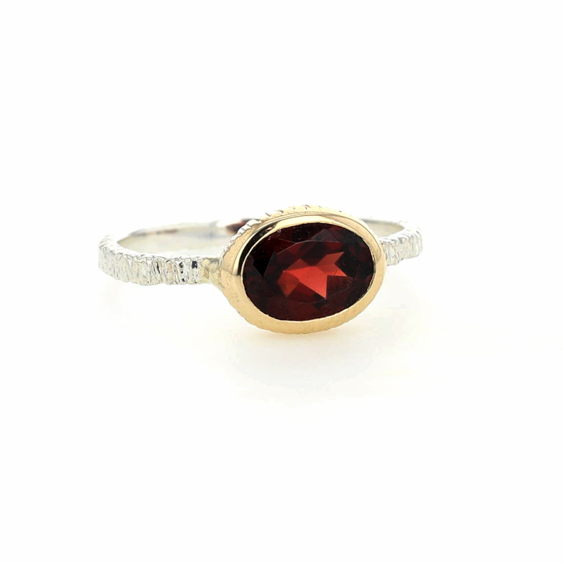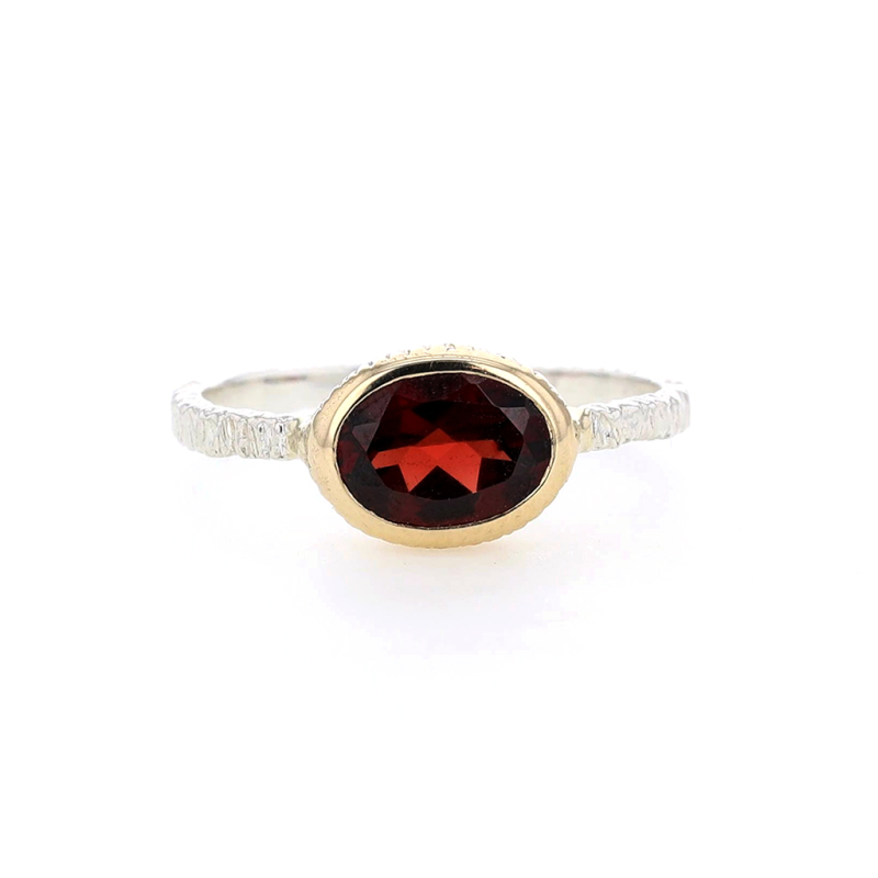 An oval Garnet is set in a 14k gold textured frame on a sterling silver band in this ring by Danielle Welmond.