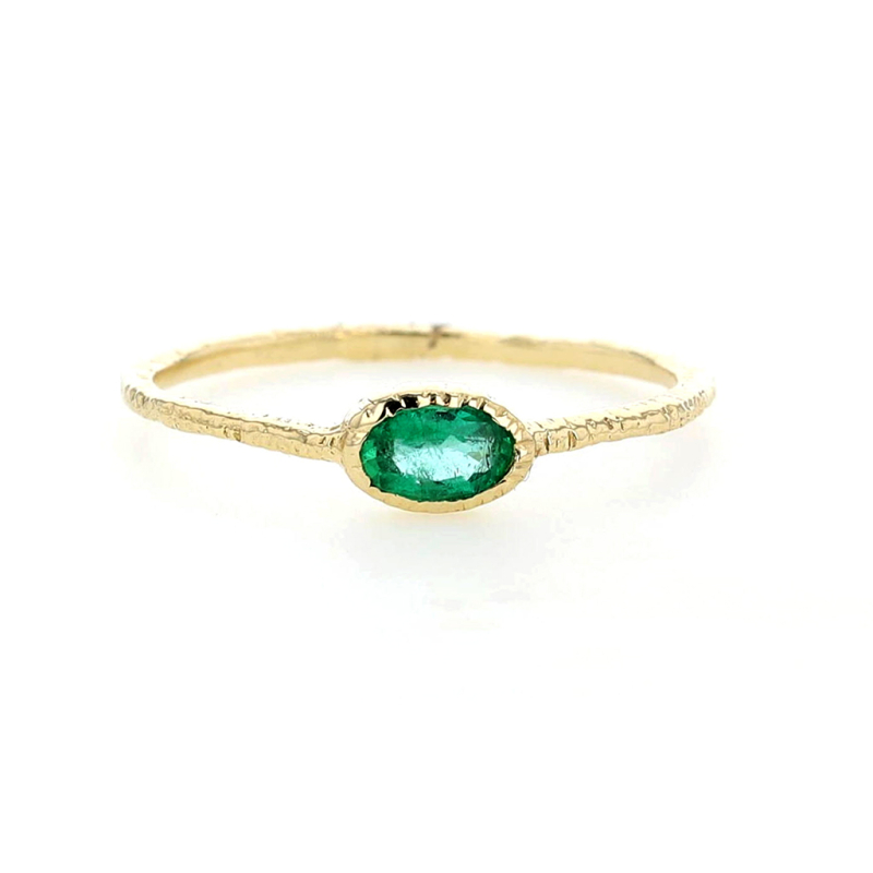 An oval Emerald is hand-set in a 14k gold textured band in this ring by Danielle Welmond.